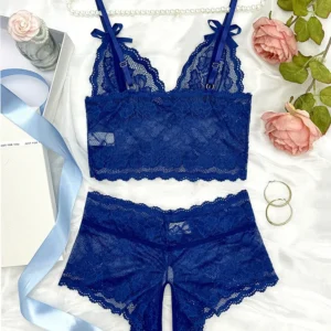 Kits transparentes de renda para mulheres, lingerie sensual, conjunto de roupas íntimas femininas sem crotchless, azul escuro oco, conjuntos exóticos, tentação